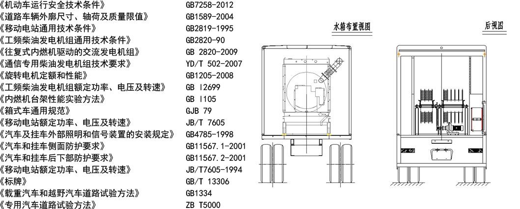 电源车作为应急电源,除了具有固定式发电机组的***点外,还应具有行驶性能良好、应急、移动能力强、可在野外露天工作等***点。满足用户提出的性能要求的条件,符合******种车辆及发电机组电源标准;控制系统采用数字智能式中文界面、内装多***保护程序,机组的全工作过程实现安全及自动化; a机组设计紧凑,体积小、重量轻。系统采用单元化、标准化、规范化设计制造; b机组自动化程度***、操作简单,具有无人值守功能;易于维修; c全天候起动可靠,加载时间快; d具有无外电源起动(电瓶起动)功能; e电源车机动性能强、可靠性***;安全性好; f整车适用性强,整体外型美观大方。 动力移动电源车执行标准 本次电源车产品设计、制造及安装调试主要是依据招标技术规范书中所提出标准及***对此类产品制定的相关标准,其主要引用的标准如下: |